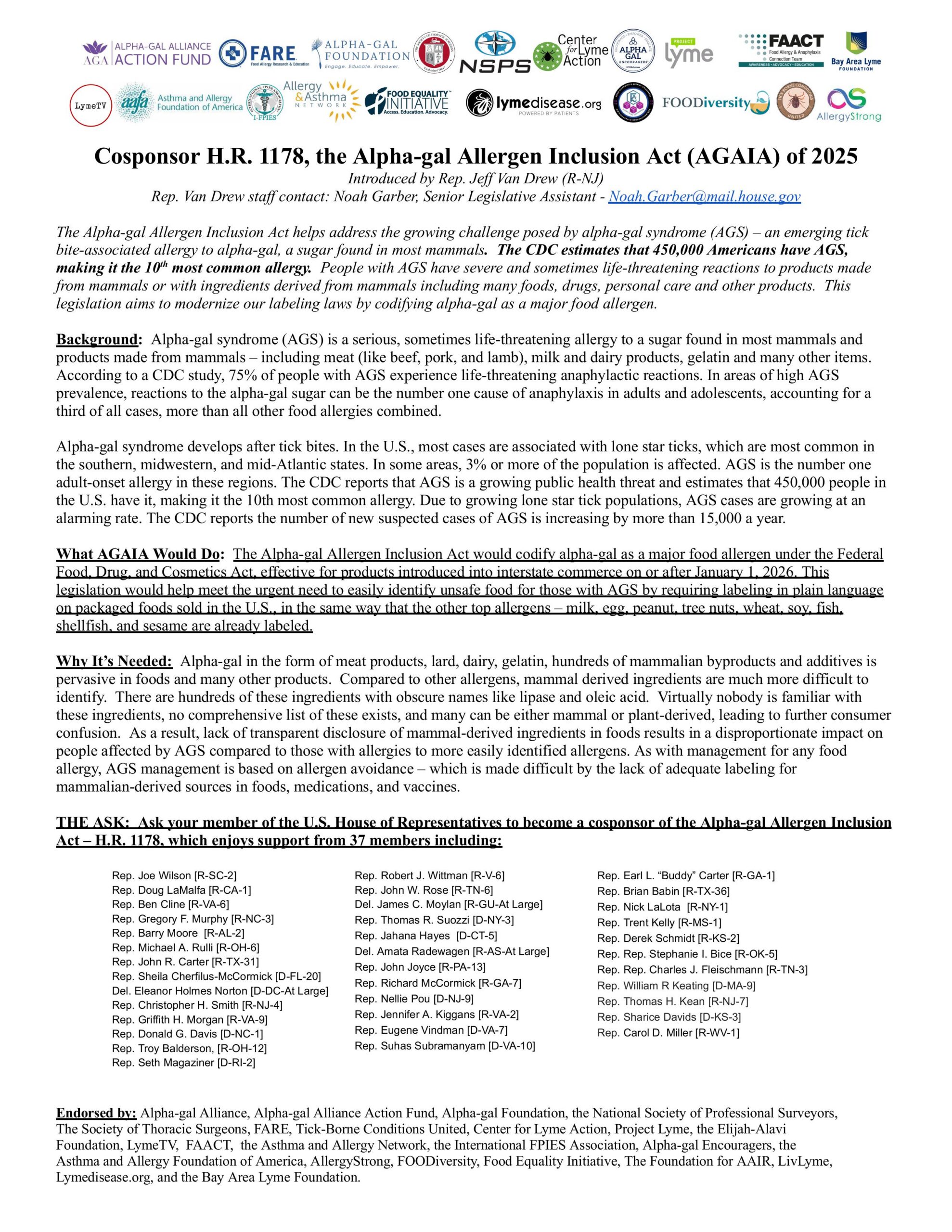 - Cosponsor the Alpha-gal Allergen Inclusion Act, if they haven’t already (check here)